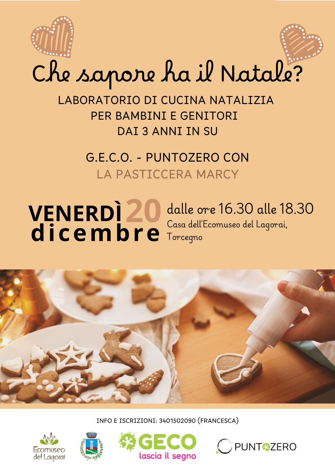 Laboratorio di cucina natalizia per bambini e genitori dai 3 anni in su che si terrà venerdì 20/12/2024 dalle ore 16.30 alle ore 18.30 nella casa dell'Ecomuseo del Lagorai a Torcegno, realizzato dalla G.E.C.O - Punto Zero con la Pasticceria Marcy